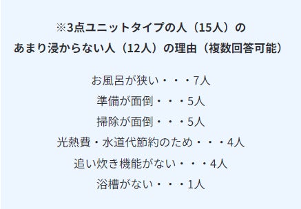 セパレート・2点ユニットタイプの「ほぼ毎日入る」かたの割合が2割前後なのに対し、3点ユニットタイプの「ほぼ毎日入る」かたの割合は6.67%という結果に。これらはお風呂の狭さなどに関係してくるのではと考えられましたが、実際に3点ユニットタイプの人であまりお風呂に浸からないというかたの理由を伺ってみると、12人中7人が「お風呂が狭い」を理由に挙げていました。