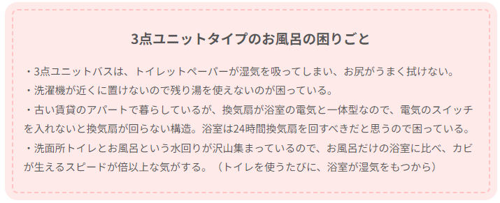 なお、3点ユニットタイプの浴室では、お悩み事もセパレートタイプとはだいぶ異なるものが上がりました。