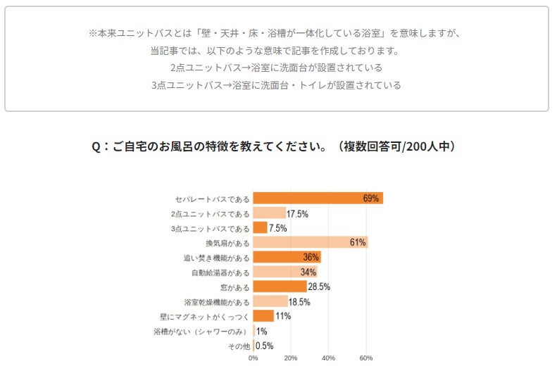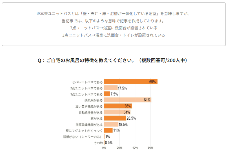 一人暮らしのお風呂、というと、バストイレ・洗面台が一緒の3点ユニットまたはバス洗面台が一緒の2点ユニットといったタイプが多いイメージがありますが、意外とユニットタイプを使用しているかたのほうが少ないという結果に。