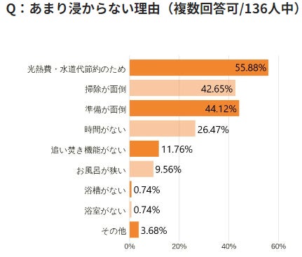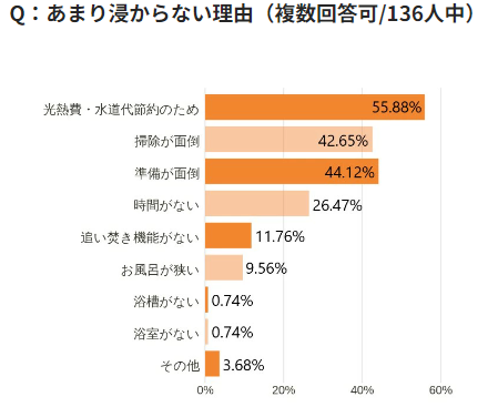 あまり浸からない理由としては、光熱費・水道代節約のためと回答したかたが55.8%(76人)で、半数以上という結果に。掃除が面倒・準備が面倒、という人もそれぞれ半数近くのかたが挙げています。