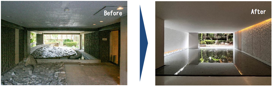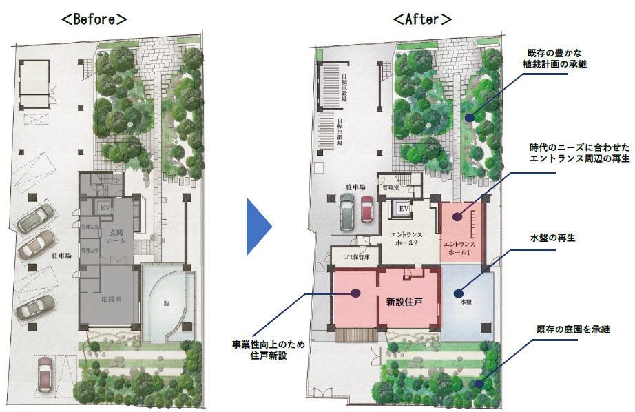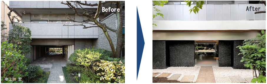 本物件は、既存建物の特性を生かし、単に新築同等に再生するのではなく、承継すべきものにも着目した共用部の再生計画としております。まず、従前より建物入り口にあるオーナーと共に歩んできた緑豊かな植栽は、施工計画段階から植栽への影響を最小限にするよう配慮し、庭園の景観を承継する計画としております。また、エントランス周辺は、時代のニーズに合わせて計画的、意匠的再生を図り、従前の応接室を、既存の庭園を最大限活かせるよう住戸へ用途変更し、更なる事業性向上を図っております。