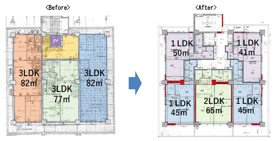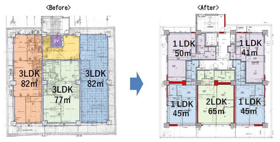 本物件は、建築当初にはなかった日影規制等の建築基準法の適用を受けることに伴い、建替えると建物規模が縮小されることから、十分な事業性能が確保できないといった課題を抱えておりました。今般、リファイニング建築を活用した再生を目指すことで、建物規模を維持した事業を実現するとともに、現代の賃貸マーケットニーズに合わせた間取り構成や商品企画により、新築に近い賃料設定を実現し、事業性能の確保が図れます。なお、竣工後は三井不動産レジデンシャルリースでサブリースを予定しております。