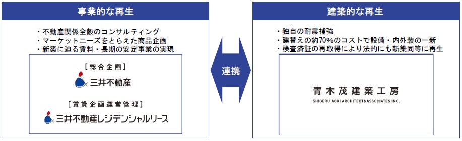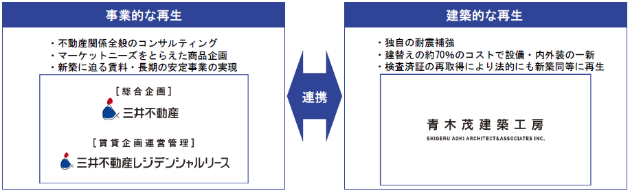 本サービスは、旧耐震基準の建物を中心とした老朽化不動産をご所有のオーナー様に対して、単に建築的な再生を図るだけでなく、三井不動産グループの連携により、不動産全般のコンサルティング、商品企画、賃貸管理運営等、事業的な再生までサポートし、老朽化不動産の抱える様々な課題を解決します。