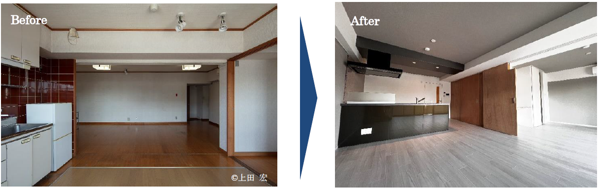 建て替えと比較して約70%のコストで設備、内外装を一新。解体と新たな躯体の建築が必要ないため、工期も短縮されます。※1