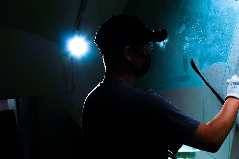 衝動と直感と閃きで描き始め、スタートダッシュしたスプレーは曲がりきれないままキャンバスをはみ出していく。時にはどこに何を描いてるかわからないほどキャンバスにくっつきながら、、、。徐々に減速して息を整えていく。少し立ち止まったあとは風景を見ながら走るように筆もゆっくり走る。少し休憩。水を飲む。まだまだ完成は遠い。