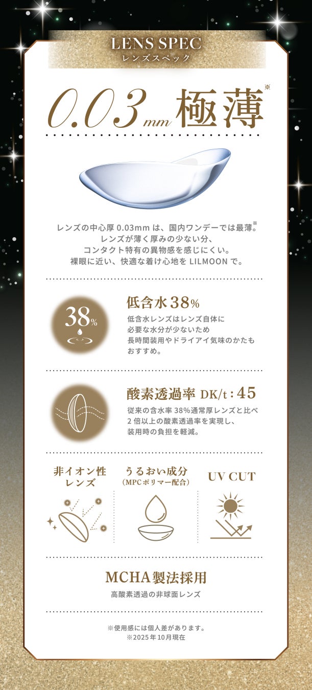 LILMOON(リルムーン)「0.03シリーズ」は、全度数レンズの中心厚が0.03㎜で、国内ワンデーでは最薄※2です。レンズが薄く厚みが少ない分、まるで裸眼のような快適な付け心地でコンタクト特有の異物感を感じにくいです。
