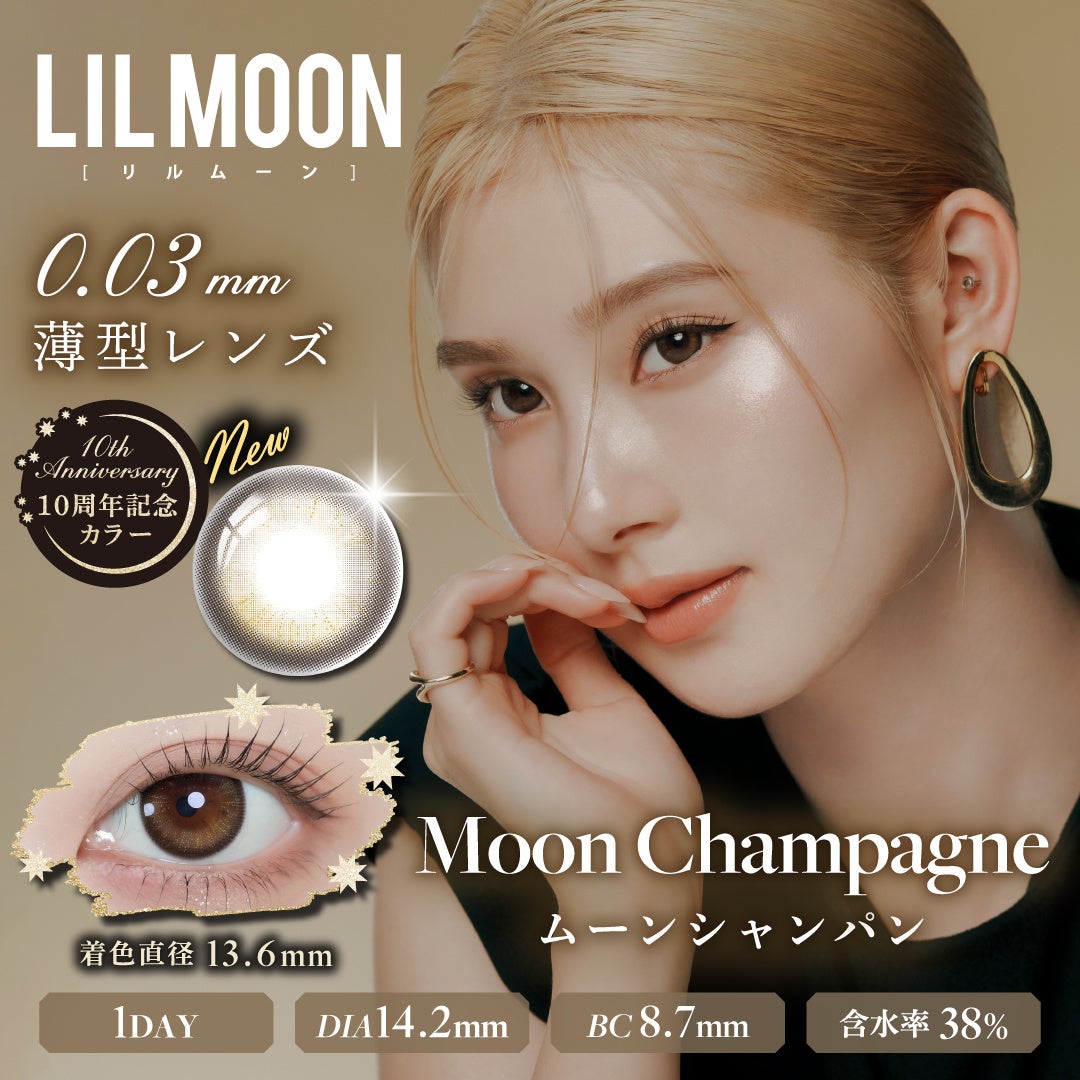 『LIL MOON(リルムーン)』は、高発色なのにうるっと盛れる透明感レンズで主役級のきらめく瞳にみせるカラーコンタクトレンズブランドです。豊富なカラーラインナップを展開しているロングセラーブランドLILMOON(リルムーン)から0.03㎜薄型レンズ「ZEROシリーズ」の待望の新色が登場。今回の10周年記念カラーは、ラグジュアリーなパッケージ、グラスに注いだシャンパンをイメージしたきらめきある繊細なレンズとなります。