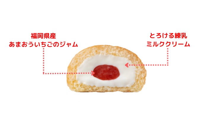 ふんわりしっとり柔らかな生地の中にミルククリームと福岡県産のあまおういちごを使用した”あまおういちごジャム”を2層仕立てで入れました。一口食べると練乳ミルククリームの優しい味わいと、ジューシーないちごジャムが広がる、まるで「食べるいちごミルク」のような味わいをお楽しみいただけます。