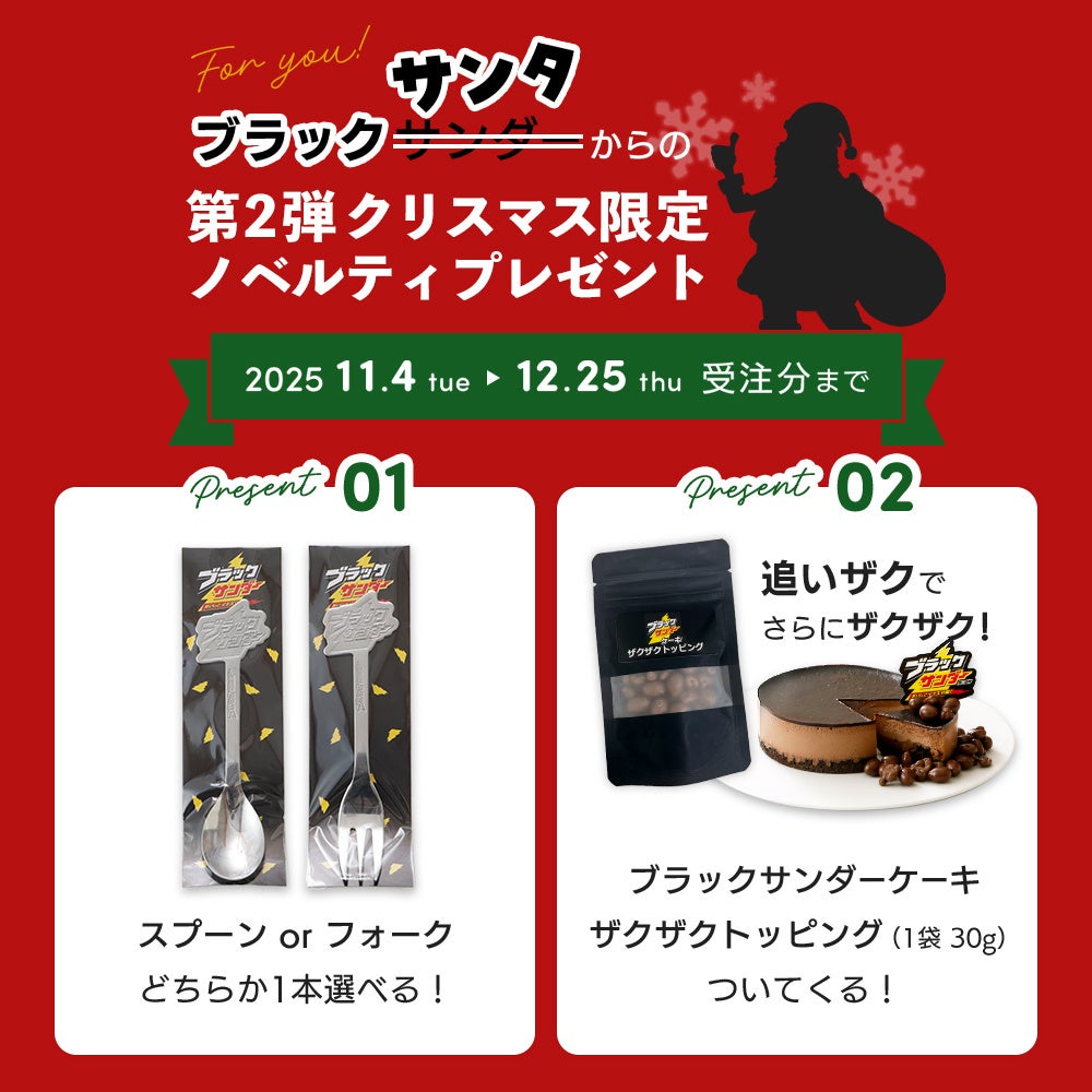 キャンペーン内容:「ブラックサンダーケーキ」1個ご購入につき、ブラックサンダースプーンまたはブラックサンダーフォーク(いずれか1本)をプレゼント(各種数量限定、なくなり次第終了)。