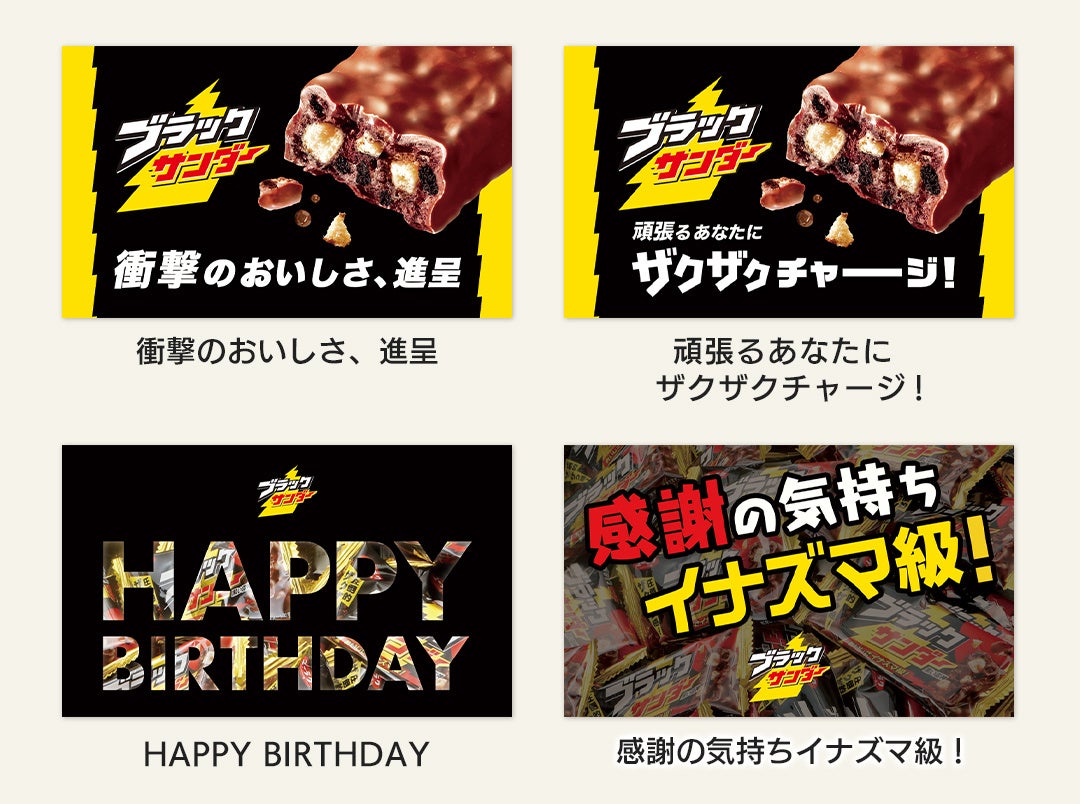 「もっと新しいブラックサンダーの魅力をお届けしたい」「日常だけでなく特別な日にも楽しんでいただきたい」という想いから誕生した「ブラックサンダーケーキ」。その想いを形にするため、購入時には無料でロウソクをお付けし、さらに4種類から選べるメッセージカードもご用意しました。お誕生日や記念日のお祝いにプラスすれば、ぐっと華やかに。プレゼントにもぴったりで、大切な人と過ごす特別な時間をより楽しく演出します。
