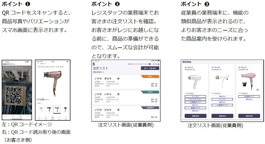 今回、新たな顧客体験価値の具現化の第1弾として、来店から商品購入までのさまざまな場面で、お客さまをサポートする、以下2種類のデジタルサービスをノジマの全ての店舗(221店舗)にて、提供を開始します。
