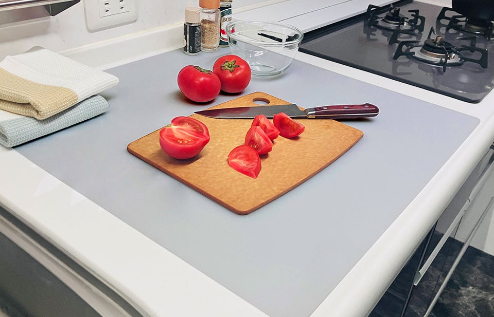 一般的な薄手のマットとは異なり、2mmというしっかりとした厚みを持たせることで、衝撃吸収性を高めました。重い調理器具を置いた際の傷防止はもちろん、食器を置く際の「ガチャガチャ音」を和らげ、深夜や早朝の調理も静かに行えます。