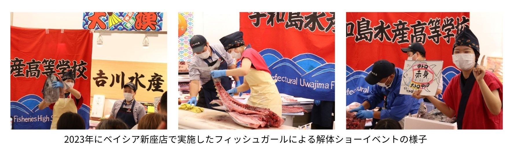 株式会社ベイシア(本社:群馬県前橋市、代表取締役社長:相木孝仁)は、ベイシア新座店内の鮮魚売場に出店している𠮷川水産株式会社(本社:東京都世田谷区、代表取締役社長:森伸夫、以下「𠮷川水産」)にて、3月23日(土)、24日(日)に愛媛水産フェアを行い、23日(土)には生本まぐろ解体ショーを開催いたします。本イベントは愛媛県と𠮷川水産が水産物普及活動を目的として実施しています。解体ショーでは愛媛県立宇和島水産高等学校の「フィッシュガール」が登場し、過去の開催でもお客様から大変ご好評をいただいております。