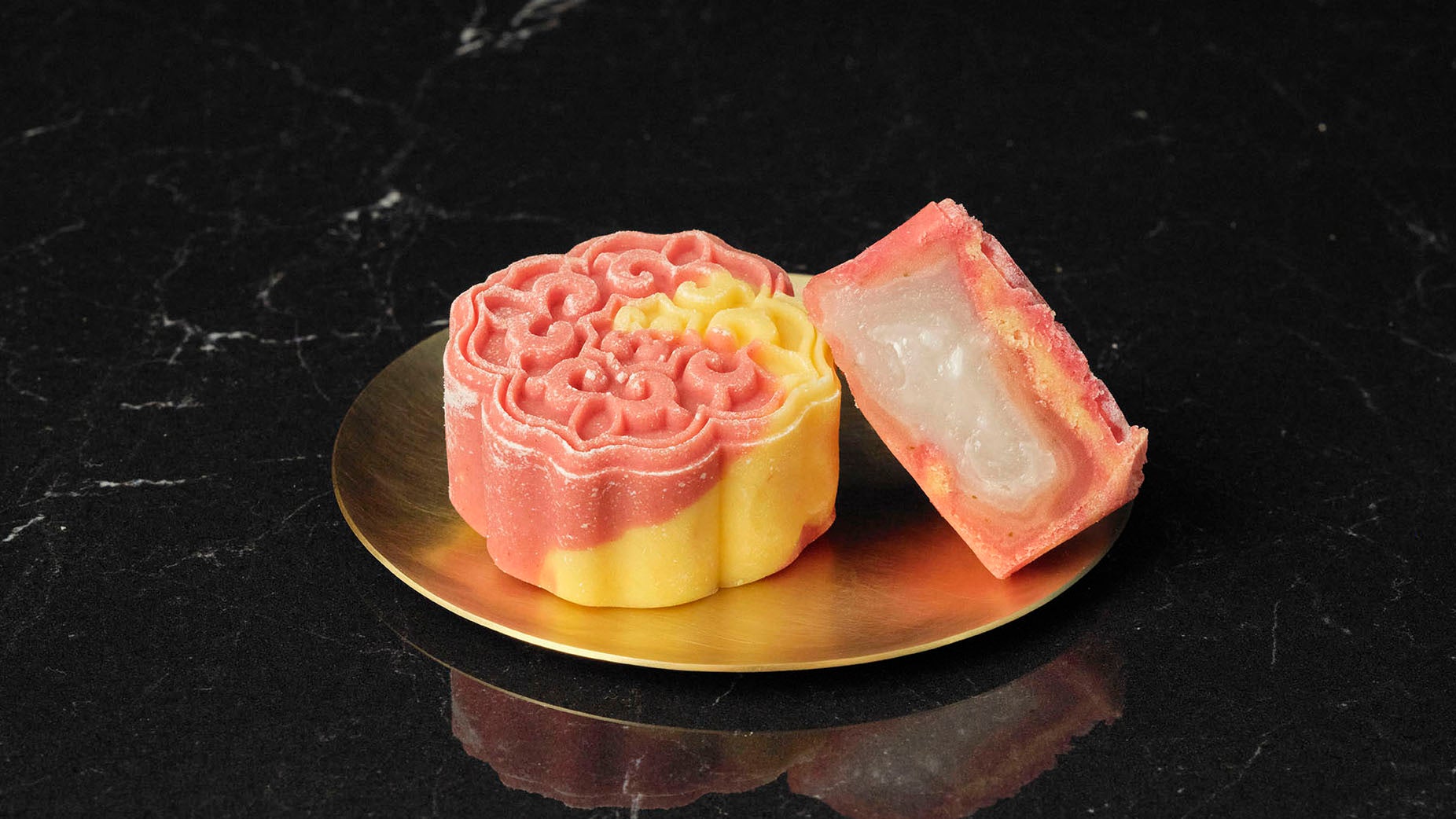 薔薇の花びらを練り込んだ淡いピンクのあんで、柔らかな求肥を包み込んだ、華やかな薔薇の香りを楽しむ、贅沢な味わいのムーンケーキです。