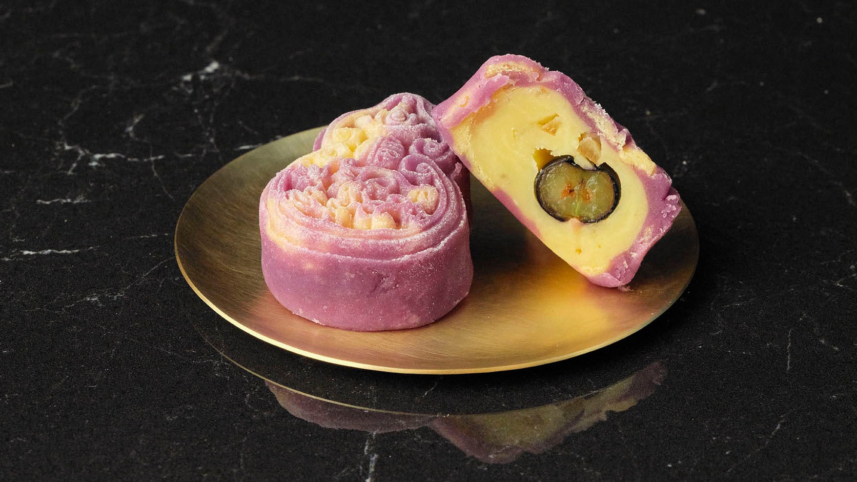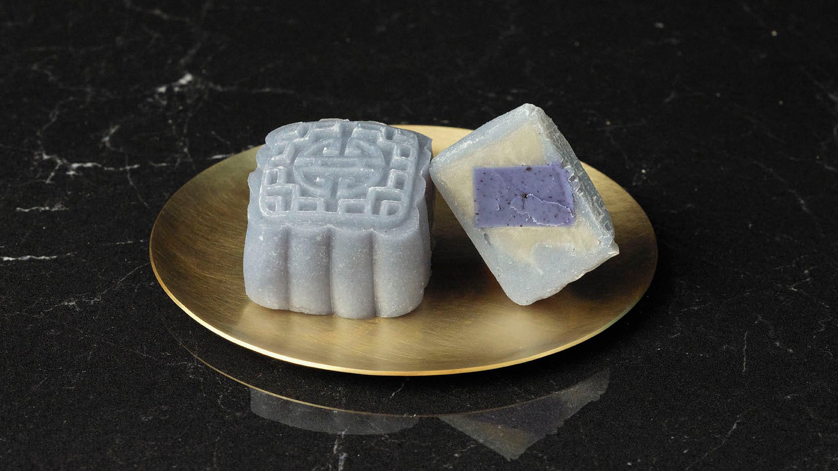 ブルーベリーをレモンピール入りのクリームチーズあんで包み込んだ緑豆ムーンケーキは、クリームチーズのコクとレモンの爽やかな酸味を楽しめます。