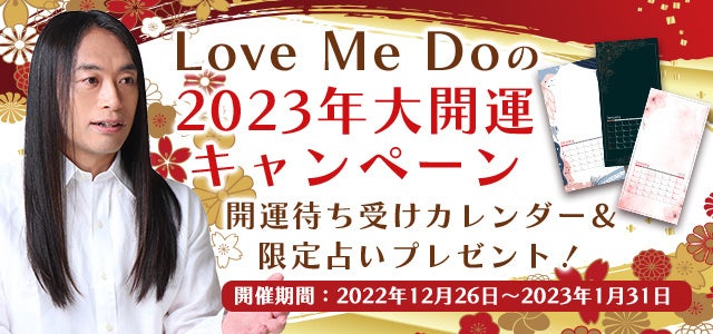 有名人の電撃婚や世界的なビッグニュースの予言を的中させて大人気の占い師Love Me Doの公式サイト『Love Me Do◆絶対数』では、『2023年大開運キャンペーン』を開催いたします。期間中、対象鑑定をご購入頂いた方は、お好きなキャンペーン限定開運占いを1つ選んで占っていただけます!さらに、対象鑑定のうち、2023年の運勢を占っていただいた方には、「開運待ち受けカレンダー」をプレゼント!