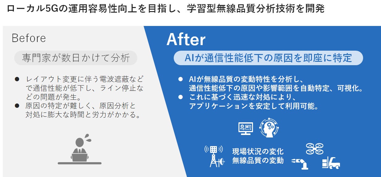 従来の広域ネットワークでは、サービスのエリア毎に通信性能を平均的に向上させる取り組みが進められてきました。これに対し、デジタルトランスフォーメーション(DX)を推進する現場では、ロボットの作業速度や継続性などのアプリケーションの性能が生産性に大きく影響するため、通信性能要件を通信セッション単位で守ることが求められます。しかし実際の現場では、レイアウト変更や機器・モノ・ヒトの移動などにより無線品質が変動し通信性能が低下することがあります。電波は目に見えないため低下の原因を特定することが難しく、分析に膨大な時間と労力を要します。このため、原因を自動特定する技術が必要とされていました。