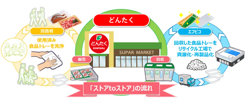 どんたくの各店舗では、地域の皆様のご協力のもと、店頭に設置している回収ボックスにて使用済み食品トレーや透明容器を回収しております。回収された大切な資源は、すべてエフピコで資源として活用され、エコ製品(※2)として食品トレーや透明容器へと生まれ変わります。そして、これらのエコ製品が再びどんたくの売り場で使用されることで、「お店」を発着点とする「ストアtoストア」の水平リサイクルを実現しております。
