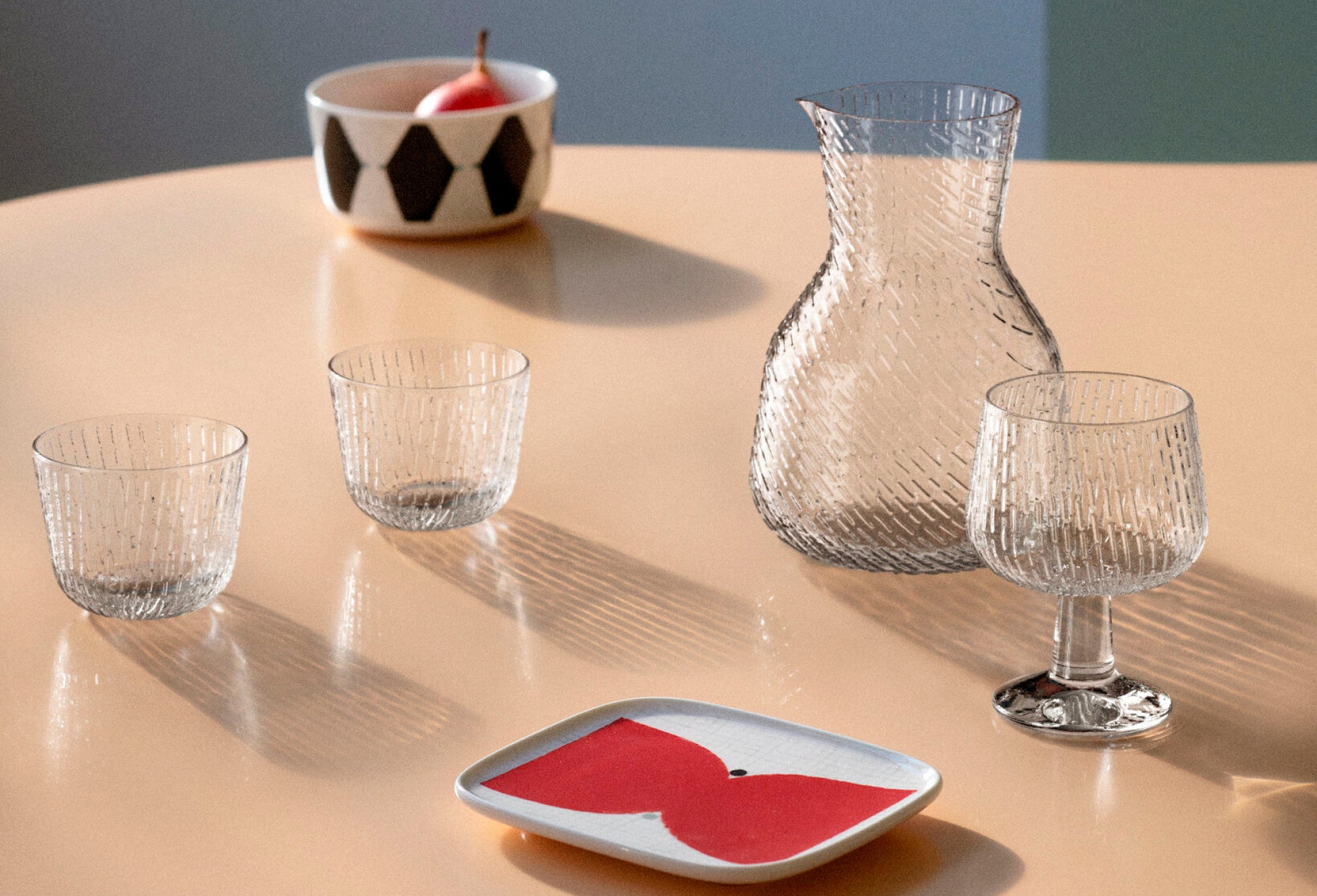 登場するのは、ワイングラス、タンブラーセット、ピッチャーの3型。実用的に設計されたミニマルなシルエットのアイテムたちは、空間に溶け込みやすく、マリメッコのテーブルウェアと組み合わせたテーブルコーディネートも楽しむことができる。