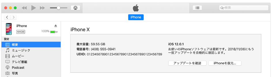 Step3: iTunesへ接続出来たら、iTunesウィンドウの左上にiPhoneのマークをが表示されます。そこからiPhoneの画面へ進むと以下のように「アップデート」と「iPhone復元」の選択肢が表示されます。
