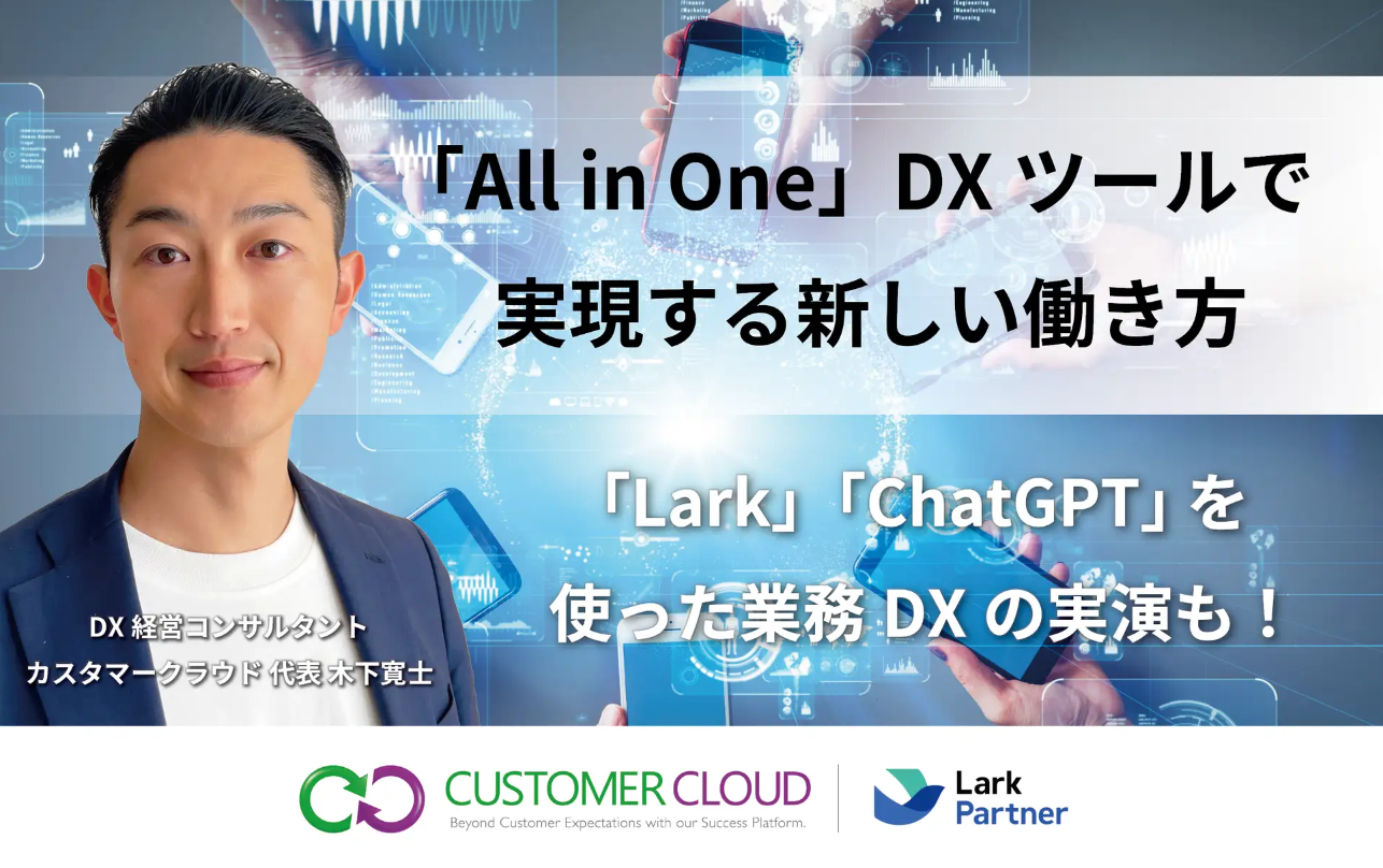 Lark公式パートナーおよび100万部(三部作)突破で話題の「識学」代理店のカスタマークラウドは、独自のAI/DX経営メソッドで、年間200件以上の経営課題の解決とAI/DX変革をサポートいたします。
