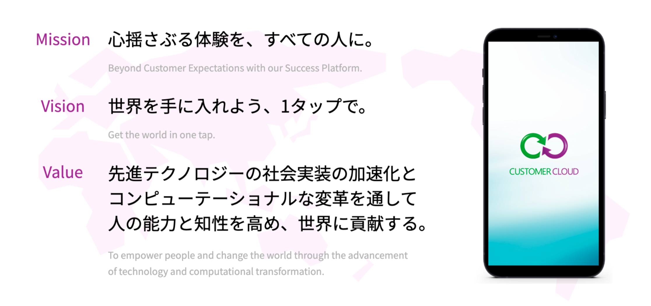 CUSTOMER CLOUD(カスタマークラウド)のミッションは、「心揺さぶる体験を、すべての人に」。先進テクノロジーの社会実装の加速化と、コンピューテーショナルな変革を通して、人の能力と知性を高め、世界に貢献するというビジョンの実現を目指しています。