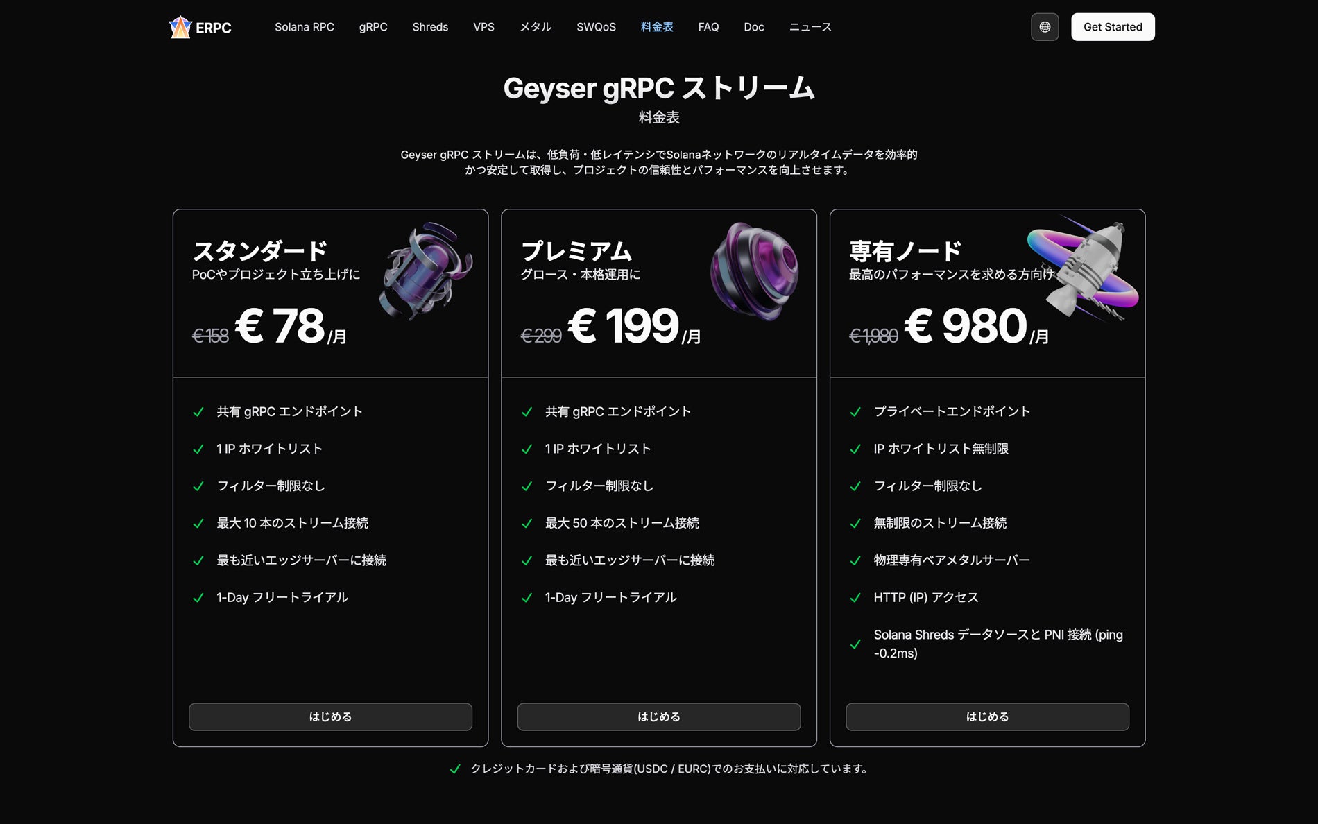 ERPC、Solana向け専有gRPC・Shredstream最上位 EPYC プランの価格改定を発表。研究開発による高効率構成で €980/月 に