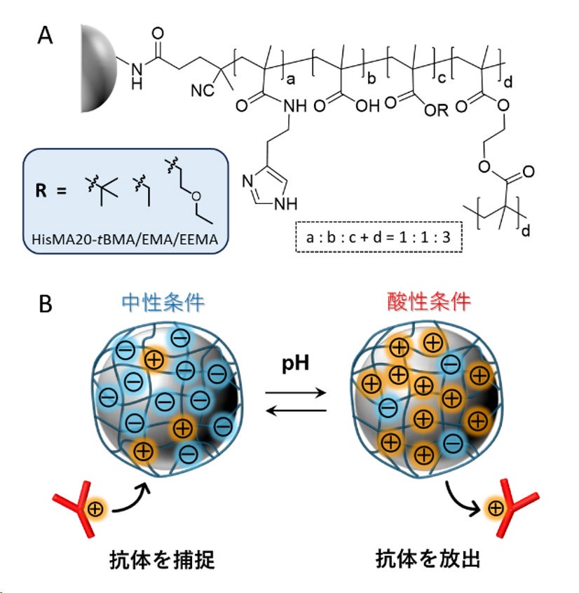 抗体医薬品は、がんや自己免疫疾患に対する画期的な治療薬として近年ますます需要が高まっています。抗体の精製コストは、抗体医薬品の総製造コストの6割程度を占めており、低コスト化が急務となっています。また、従来の精製法に用いられているプロテインAカラムには、低い安定性、高コストといった欠点を抱えています。また、低いpH条件での溶出は抗体活性の損失を引き起こす可能性が懸念されています。本研究では、タンパク質と比較して安価で安定性の高い合成高分子によってプロテインAの機能を模倣し、従来の精製法と同様の操作で抗体精製に応用しました。プロテインAの抗体結合領域(Z34C)のアミノ酸配列および、抗体との結合に重要なアミノ酸であるヒスチジンの機能を模倣し、プロテインAカラムと同様にpH依存的な抗体の保持・溶出挙動を合成高分子に付与しました。さらに、穏やかな溶出条件(pH 5)の下、ハイブリドーマ細胞培養上清から80%を超える回収率で抗体を精製することに成功しました。加えて、100回連続の精製や半年間の使用後も再現性の高い回収率を維持しており、再利用性や耐久性を有することが確認されました。以上の結果から、従来法に比べて安価で耐久性が高く、活性を維持したまま抗体精製を実現できる可能性が示されました。この技術は、市場規模の拡大を続ける抗体医薬品分野において、製造コスト削減に大きく寄与することが期待されます。
