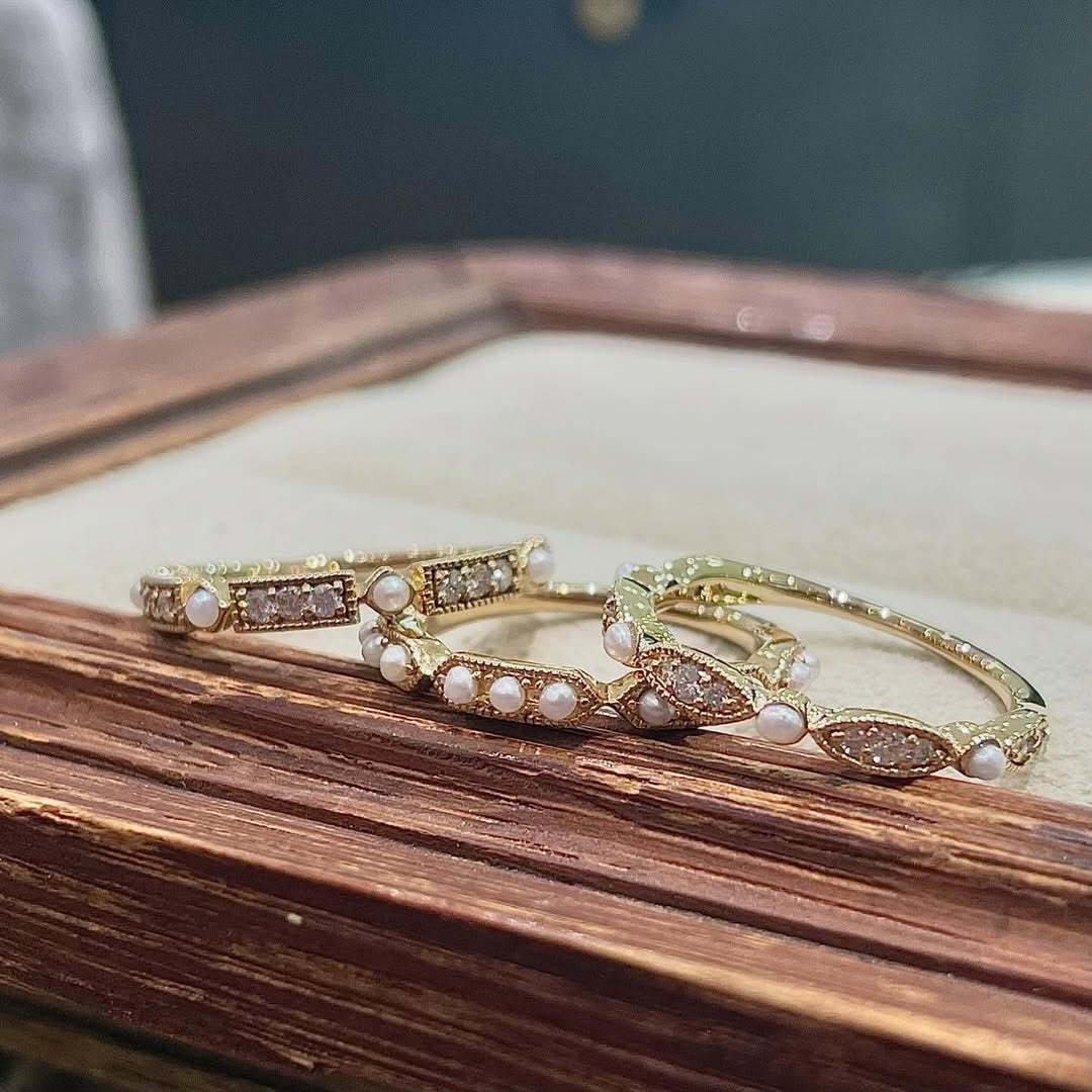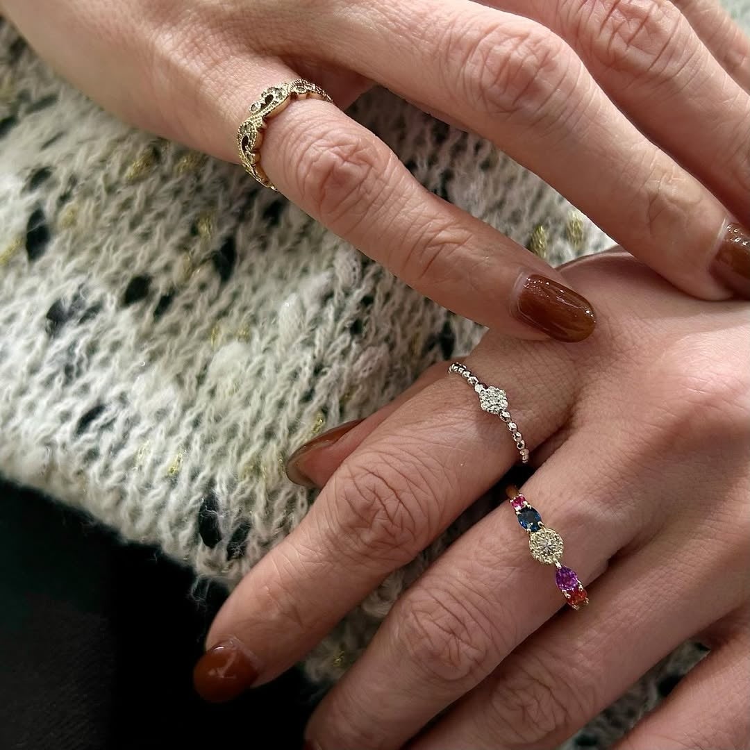 春の気配を思わせるやさしい色合いを、ゆとりのある間隔で配しました。向きや角度を揃えすぎず、一粒ごとの個性を活かした指環です。
