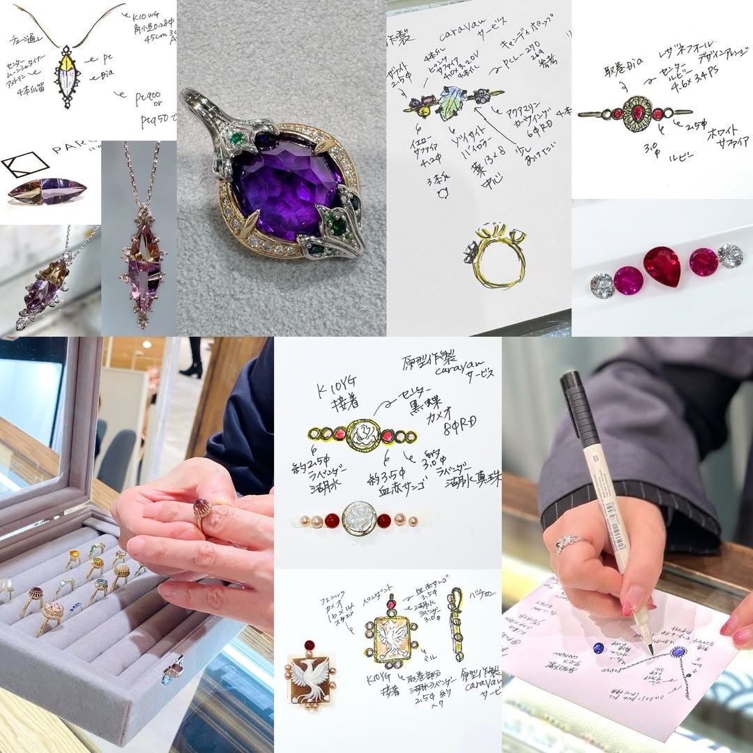 既存デザインをもとに宝石をお選びいただくセミオーダーに加え、その場でデザイン画を描きながら形を組み立てていくフルオーダーのご相談も承ります。宝石の個性を見ながらデザインを考えていく、来店イベントならではの時間をお楽しみいただけます。