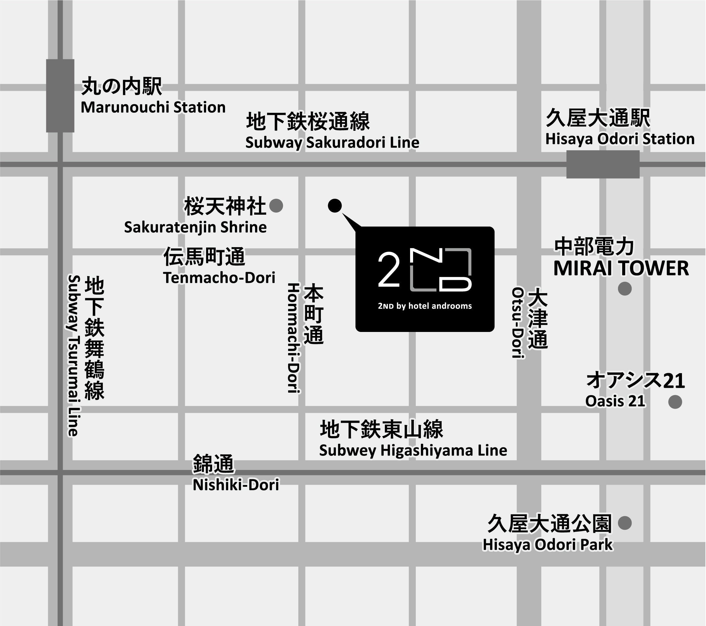 『 2ND by hotel androoms』は名古屋・大阪・京都で5軒展開している「ホテル・アンドルームス」のディフュージョンブランドです。街にあわせてホテルごとに、あったら嬉しい「&」をプラスする「ホテル・アンドルームス」のエッセンスをベースに、より気軽な宿泊スタイルをご提供いたします。「 2ND by hotel androoms 名古屋」は名古屋市営地下鉄桜通線・鶴舞線「丸の内駅」より徒歩4分に位置します。交通アクセスが良く周辺のショップも充実していて、ビジネスや観光など、さまざまなシーンでご利用いただけます。