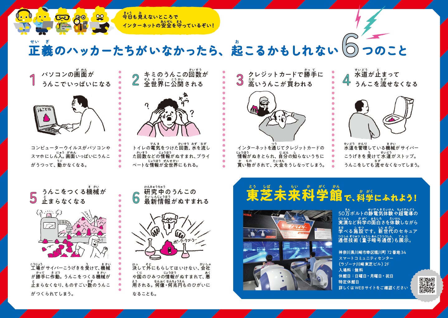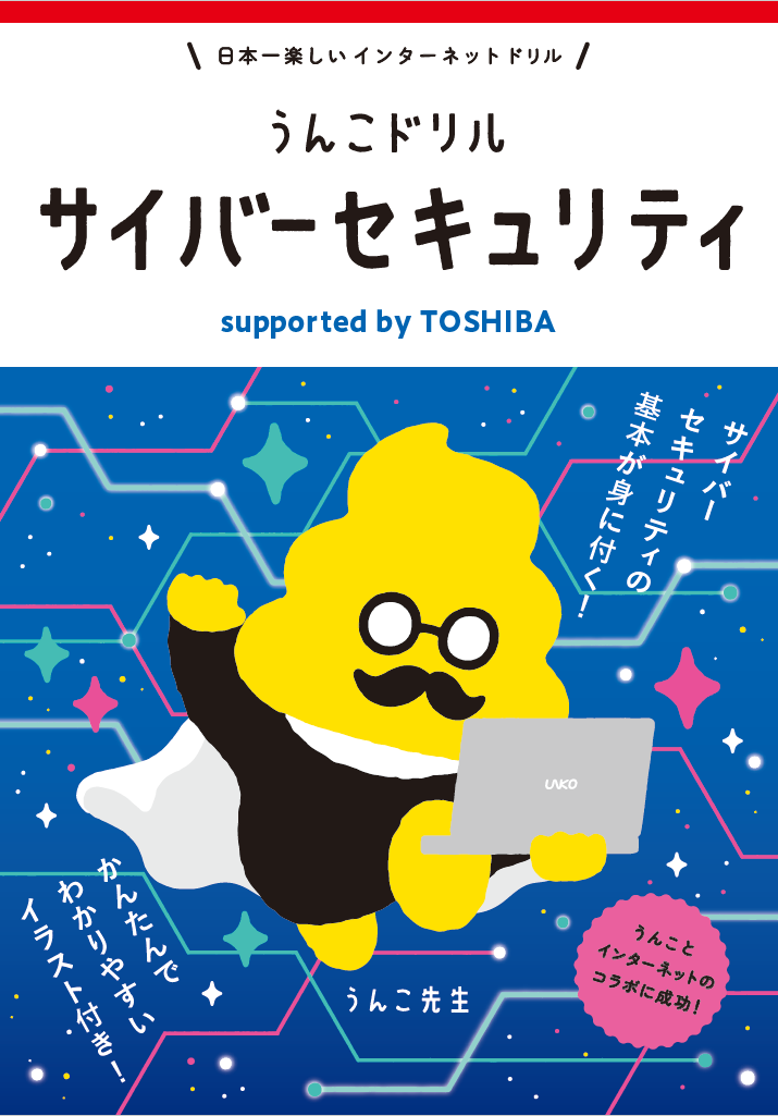「うんこドリル サイバーセキュリティ」は、サイバー攻撃に対して自ら身を守ることの重要性と方法を楽しく学び、デジタル時代におけるセキュリティの在り方について考えるきっかけになってほしいという想いから、累計1000万部を突破し小学生に圧倒的な認知と人気を誇る「うんこドリル」シリーズと、株式会社東芝がコラボして制作した冊子。