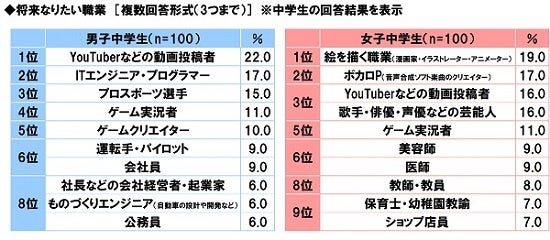 中学生についてみると、男子中学生では1位「YouTuberなどの動画投稿者」(22.0%)、2位「ITエンジニア・プログラマー」(17.0%)、3位「プロスポーツ選手」(15.0%)、4位「ゲーム実況者」(11.0%)、5位「ゲームクリエイター」(10.0%)となりました。