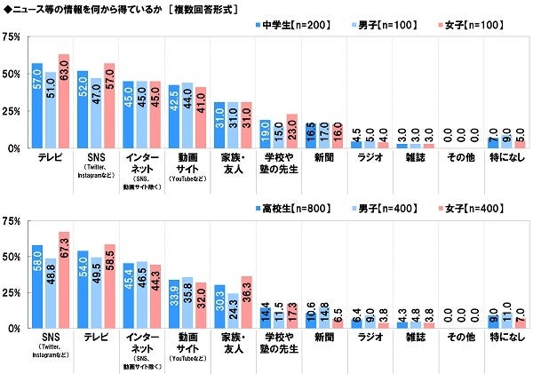 ・中高生の情報源 中学生1位「テレビ」、高校生1位「SNS」