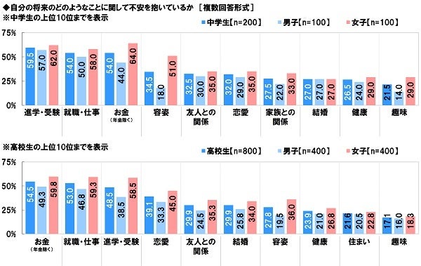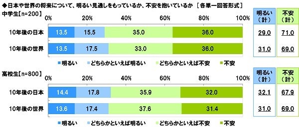 ・中高生がイメージする将来「10年後は不安」中学生45%、高校生49%