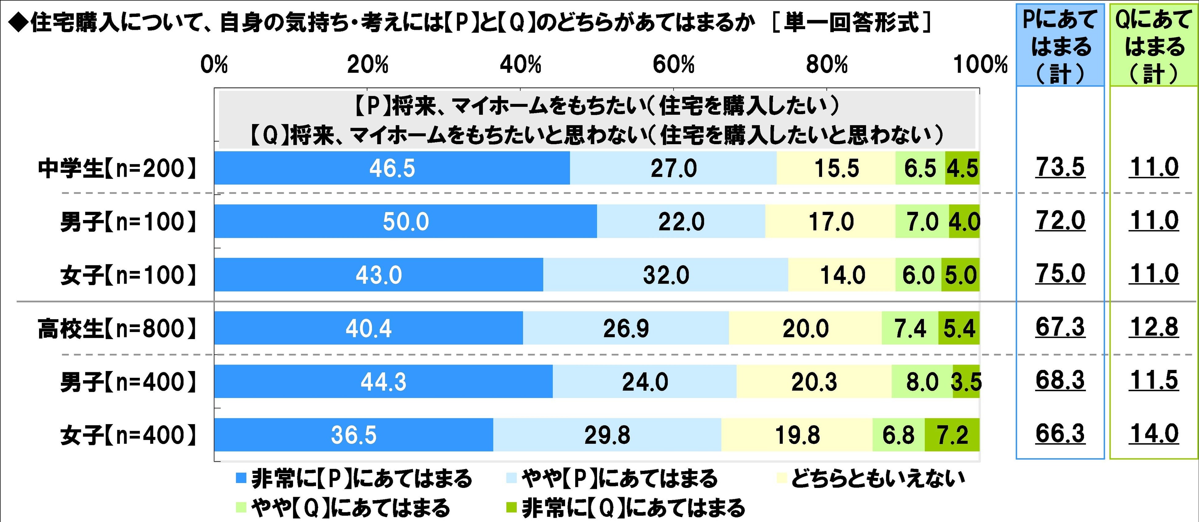 住宅購入について、「将来、マイホームをもちたい(住宅を購入したい)」と「将来、マイホームをもちたいと思わない(住宅を購入したいと思わない)」では、中学生、高校生とも『将来、マイホームをもちたい(住宅を購入したい)(計)』(中学生73.5%、高校生67.3%)が多数派でした。