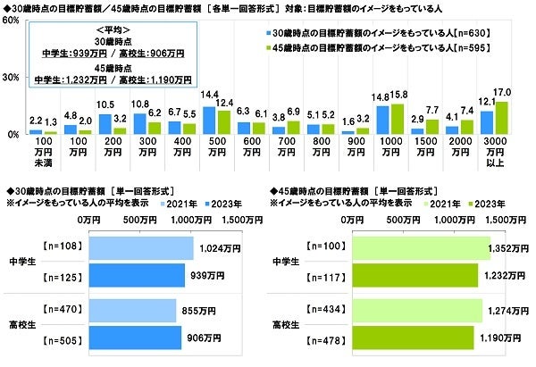 2021年の調査結果と比較すると、30歳時点の目標貯蓄額の平均は、中学生では85万円の減少(2021年1,024万円→2023年939万円)となったのに対し、高校生では51万円の増加(2021年855万円→2023年906万円)となりました。他方、45歳時点の目標貯蓄額の平均は、中学生では120万円の減少(2021年1,352万円→2023年1,232万円)、高校生では84万円の減少(2021年1,274万円→2023年1,190万円)と、どちらも減少する結果となりました。