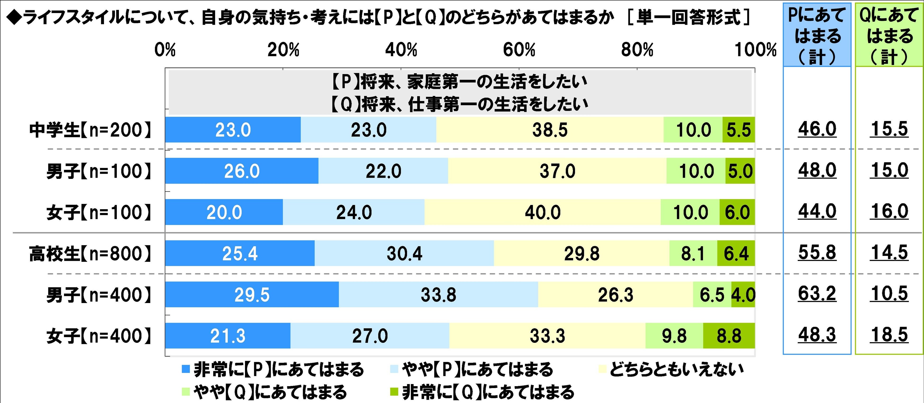 ライフスタイルについて、「将来、家庭第一の生活をしたい」と「将来、仕事第一の生活をしたい」では、中学生、高校生とも『将来、家庭第一の生活をしたい(計)』(中学生46.0%、高校生55.8%)が多数派でした。