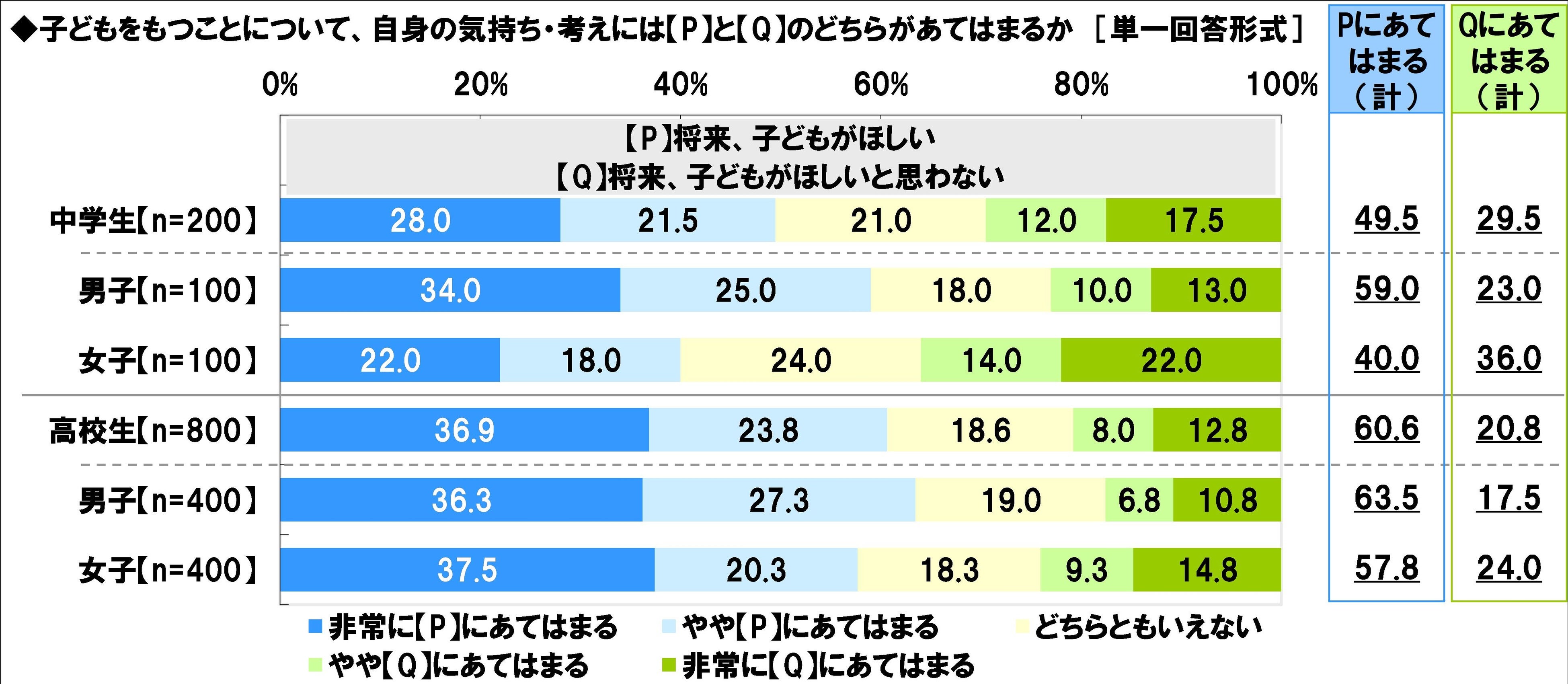 子どもをもつことについて、「将来、子どもがほしい」と「将来、子どもがほしいと思わない」では、中学生、高校生とも『将来、子どもがほしい(計)』(中学生49.5%、高校生60.6%)が多数派でした。