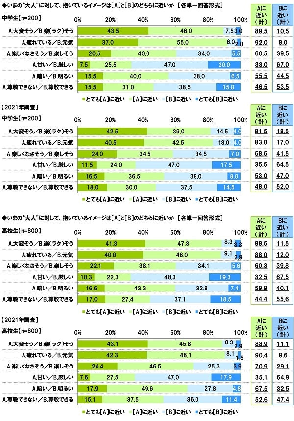 ・中高生がイメージする大人 中学生では90%が「大変そう」、92%が「疲れている」と回答