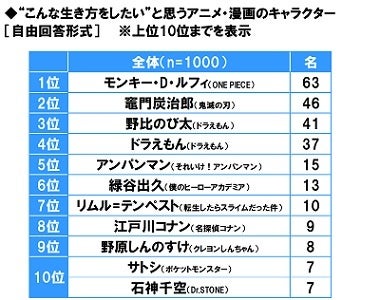 “こんな生き方をしたい”と思うアニメ・漫画のキャラクターを聞いたところ、1 位「モンキー・D・ルフィ(ONE PIECE)」、2 位「竈門炭治郎(鬼滅の刃)」、3 位「野比のび太(ドラえもん)」、4 位「ドラえもん(ドラえもん)」、5 位「アンパンマン(それいけ!アンパンマン)」となりました。