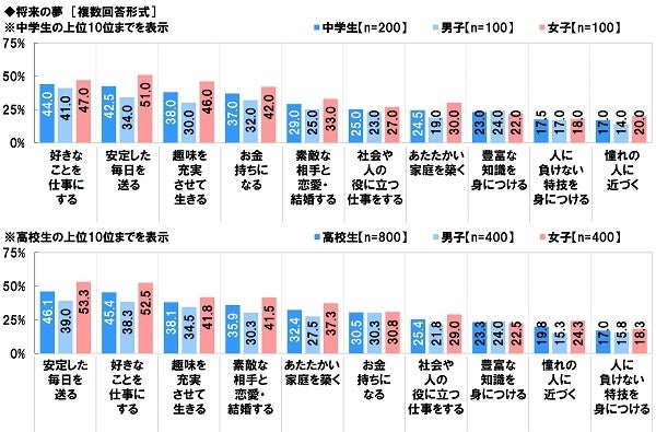 ・中学生の将来の夢 男子1位「好きなことを仕事にする」、女子1位「安定した毎日を送る」