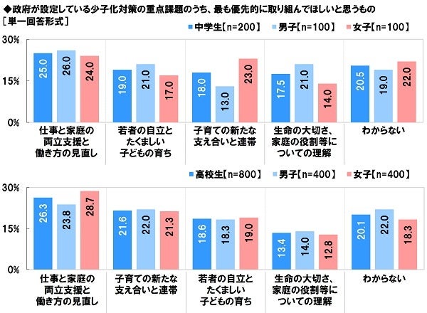 中高生の1位は「仕事と家庭の両立支援と働き方の見直し」