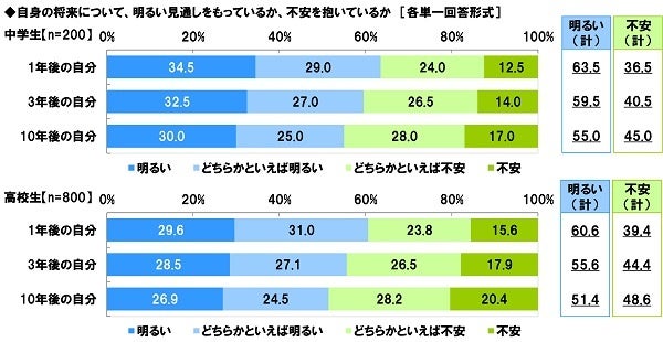 全国の中高生1,000名(中学生200名、高校生800名)に、自身の将来(1年後、3年後、10年後)について、明るい見通しをもっているか、不安を抱いているか聞きました。