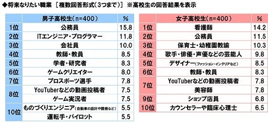 高校生についてみると、男子高校生では1位「公務員」(15.8%)、2位「ITエンジニア・プログラマー」(11.8%)、3位「会社員」(10.0%)、4位「教師・教員」(8.5%)、5位「学者・研究者」(8.3%)となりました。