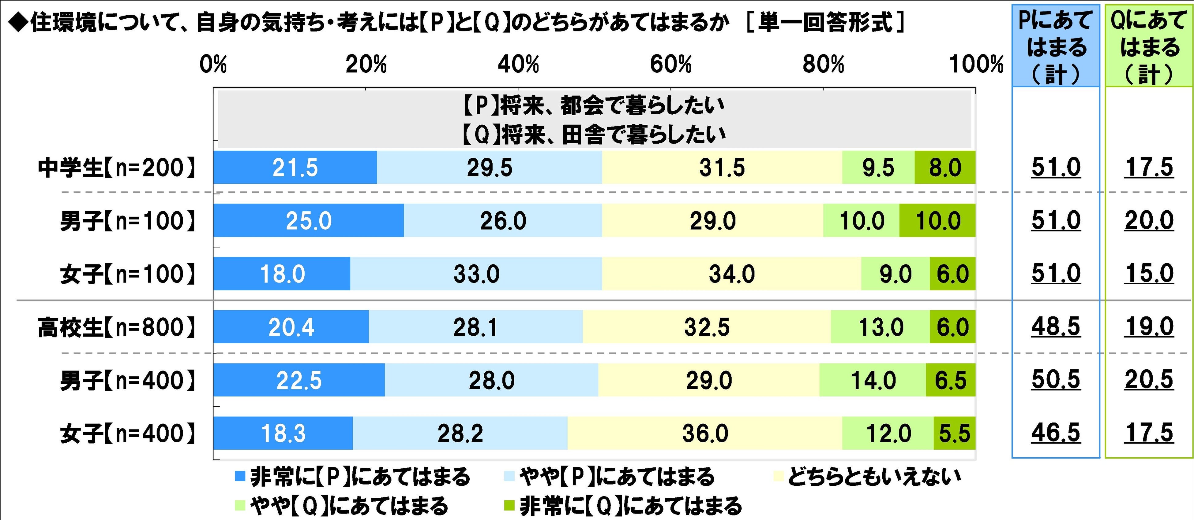 住環境について、「将来、都会で暮らしたい」と「将来、田舎で暮らしたい」では、中学生、高校生とも『将来、都会で暮らしたい(計)』(中学生51.0%、高校生48.5%)が多数派でした。将来は利便性の高い都会で生活したいと思う人が多いようです。