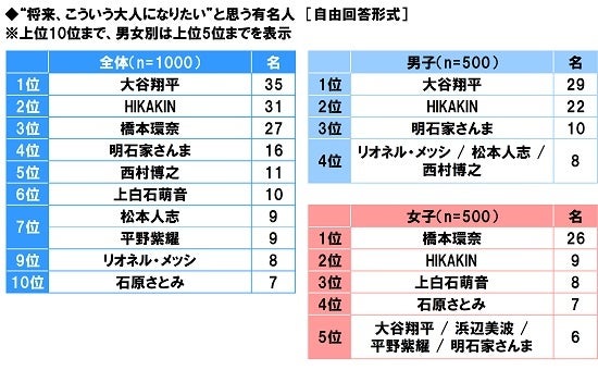 ◆中高生が“将来、こういう大人になりたい”と思う有名人 男子1 位は「大谷翔平さん」、女子1 位は「橋本環奈さん」