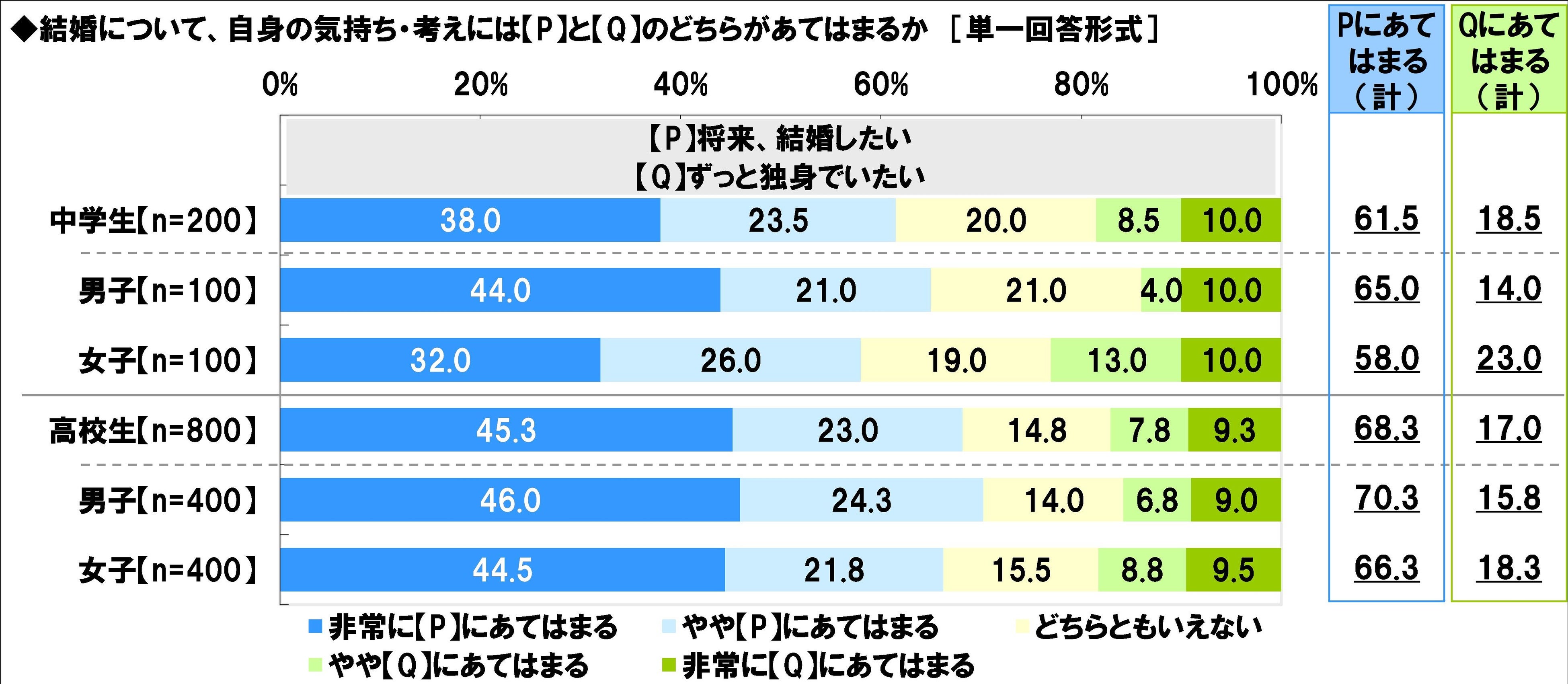 結婚について、「将来、結婚したい」と「ずっと独身でいたい」のどちらにあてはまるかでは、中学生、高校生とも『将来、結婚したい(計)』(中学生61.5%、高校生68.3%)が多数派でした。将来は結婚して家庭をもちたいと考えている人が多いようです。
