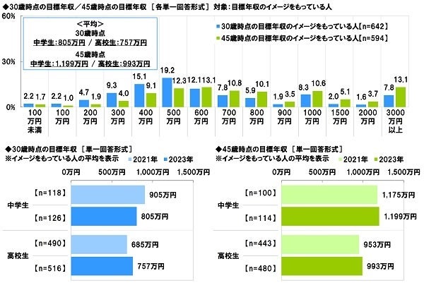 2021年の調査結果と比較すると、30歳時点の目標年収の平均は、中学生では100万円の減少(2021年905万円→2023年805万円)となったのに対し、高校生では72万円の増加(2021年685万円→2023年757万円)となりました。他方、45歳時点の目標年収の平均は、中学生では24万円の増加(2021年1,175万円→2023年1,199万円)、高校生では40万円の増加(2021年953万円→2023年993万円)と、どちらも増加する結果となりました。