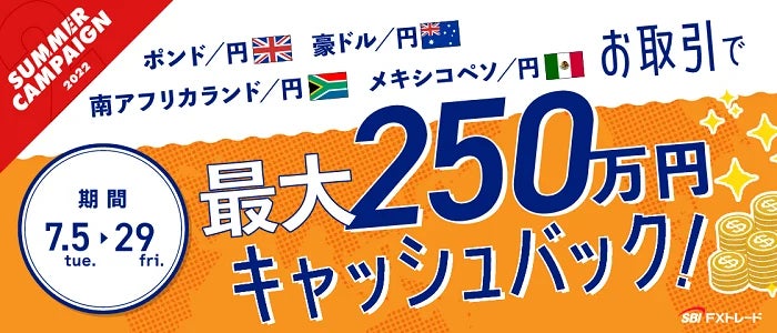 今般、2022年7月5日より、日ごろのご愛顧に感謝し、ポンド/円、豪ドル/円、南アフリカランド/円、メキシコペソ/円を対象とする3つのキャンペーンからなる『人気4通貨 夏の大還元祭』を開始いたします。